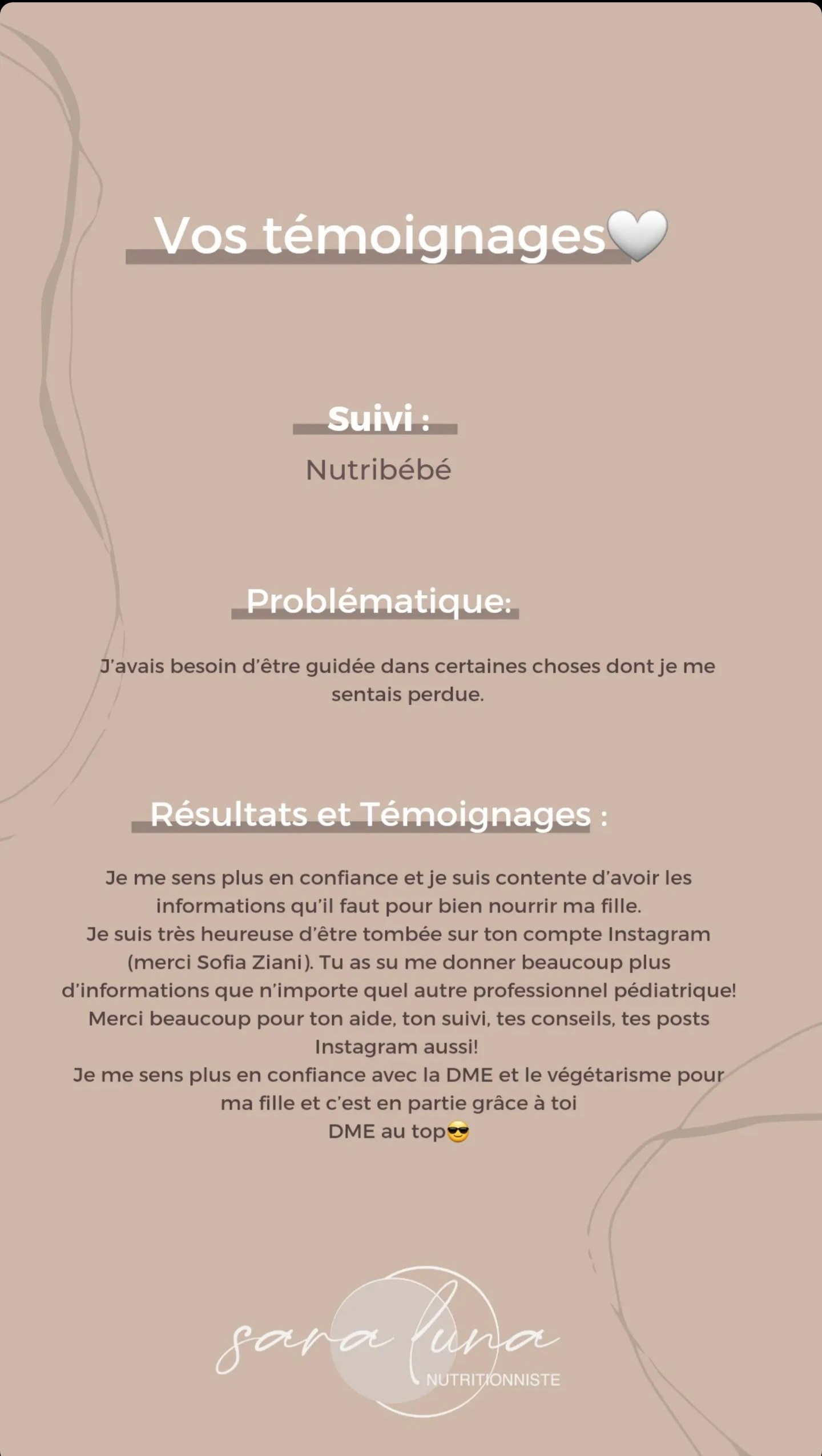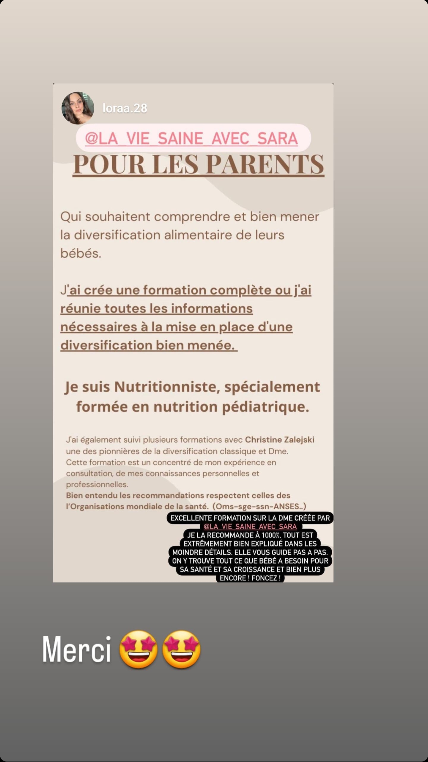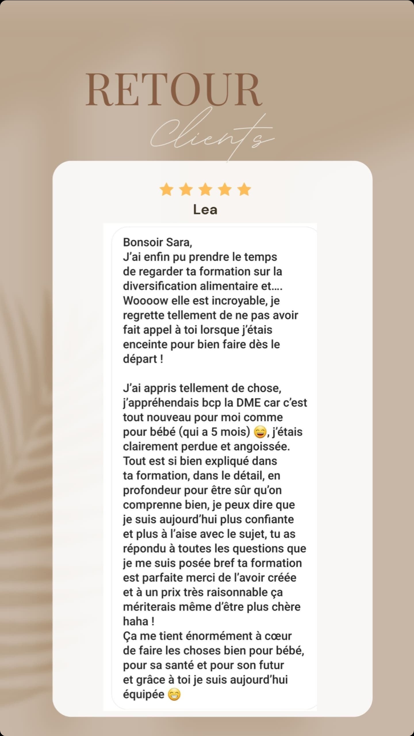 💡Diplômée en nutrition infantile, je vous transmets des informations fondées sur des preuves scientifiques et adaptées aux besoins spécifiques de votre bébé. Fini le stress et la confusion, vous aurez enfin accès à des conseils clairs et bienveillants pour accompagner votre bébé vers une alimentation saine et équilibrée.