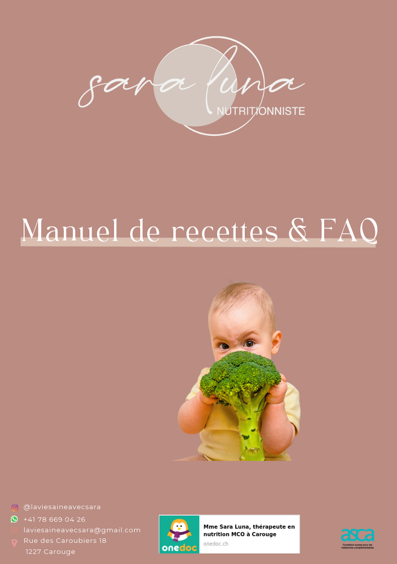 Un petit E-book de recettes avec une partie questions réponses (FAQ) pour bébé vous est offert à l'achat.